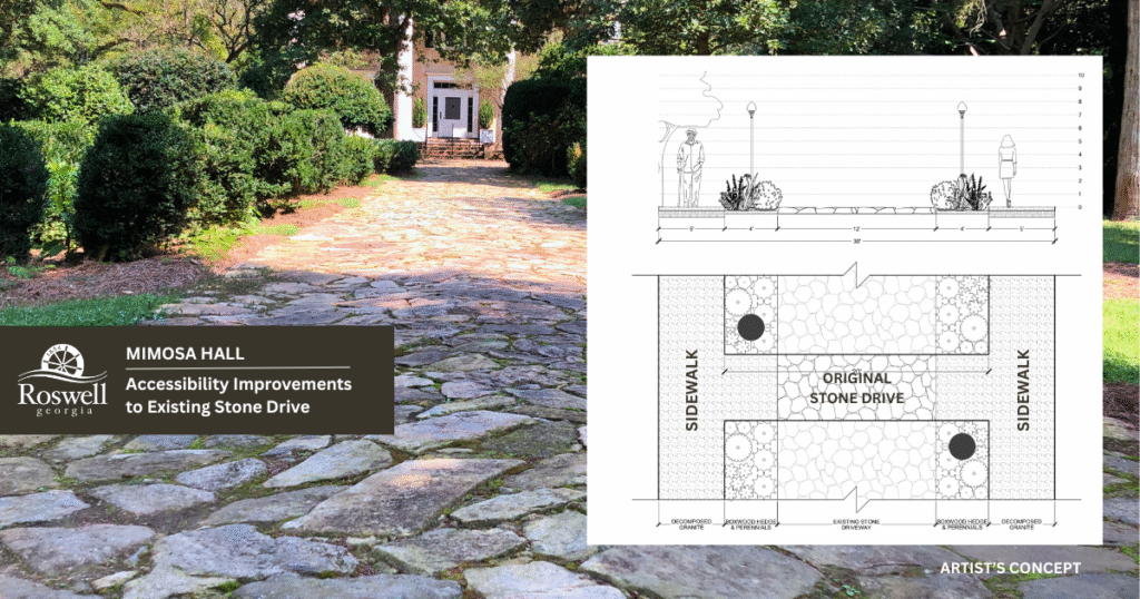 The Mimosa Hall grounds are being upgraded with a large event lawn, restrooms, a catering kitchen, ADA walkways, and improved access—all while preserving its historic features. Work on a new driveway at Mimosa Hall, as well as renovations to the inside of the facility, were completed in December 2024.