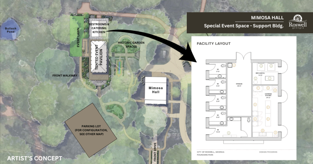 A focal point of this sweeping initiative is the redevelopment of the grounds of Mimosa Hall, where construction is currently underway to create a central hub for Founders Park: a stunning new event lawn and supporting facility. The goal is to provide a flexible, beautiful gathering space for weddings, concerts, reunions, and community events—while carefully preserving the historic charm that defines the site.