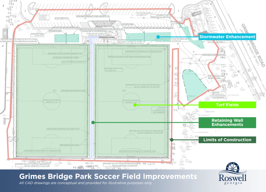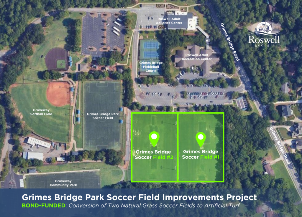 The City of Roswell is moving forward with a bond-funded construction project at Grimes Bridge Park to modernize two soccer fields, improve safety and accessibility, and address long-standing drainage and infrastructure challenges at one of the City’s most heavily used soccer facilities.