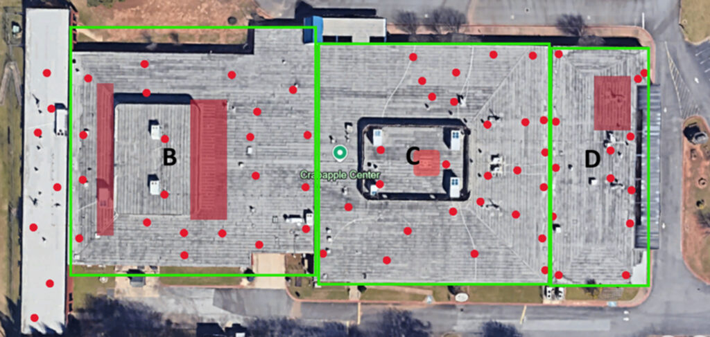 In the satellite image of the roof below, the red squares and rectangles represent old/temporary repairs on the roof along with leak locations. The red circles represent leaks found on the inside of the facility. The green outline indicates the sections for roof replacement.